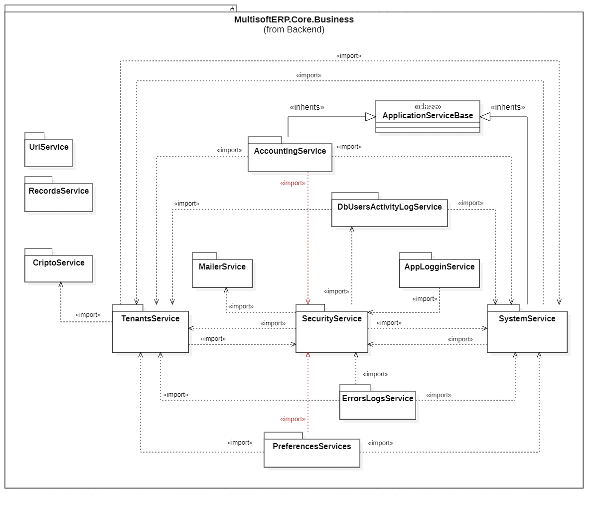 El resto de paquetes que incluyen en el diagrama son: CriptoService, paquete de servicio de encriptación usando AES (Estándar de Encriptación Avanzada). MailerService, paquete de servicio de mensajería por correo que envía, recibe y configura correos electrónicos con todos sus parámetros de configuración. AppLogginService, paquete de servicio de log de errores y que incluye en cada log el nombre de usuario, dirección ip y un mensaje. ErrorsLogsService, paquete de servicio que lee la información del log de errores de sistema y usuario, y la presenta, también puede filtrar por fecha y agregar nuevos logs de errores. PreferencesServices, paquete de servicio de preferencias de usuario en la aplicación, como los favoritos. DbUsersActivityLogService, paquete de servicio que registra las actividades de loggin del usuario, como inicio de sesión, cambio de contraseña, bloque de cuenta, etc. AccountingService, paquete con todos los servicios de contabilidad de la aplicación, como los servicios de asiento contable, servicio de planes de cuentas, servicio para el formulario 101 de impuestos, entre otros.