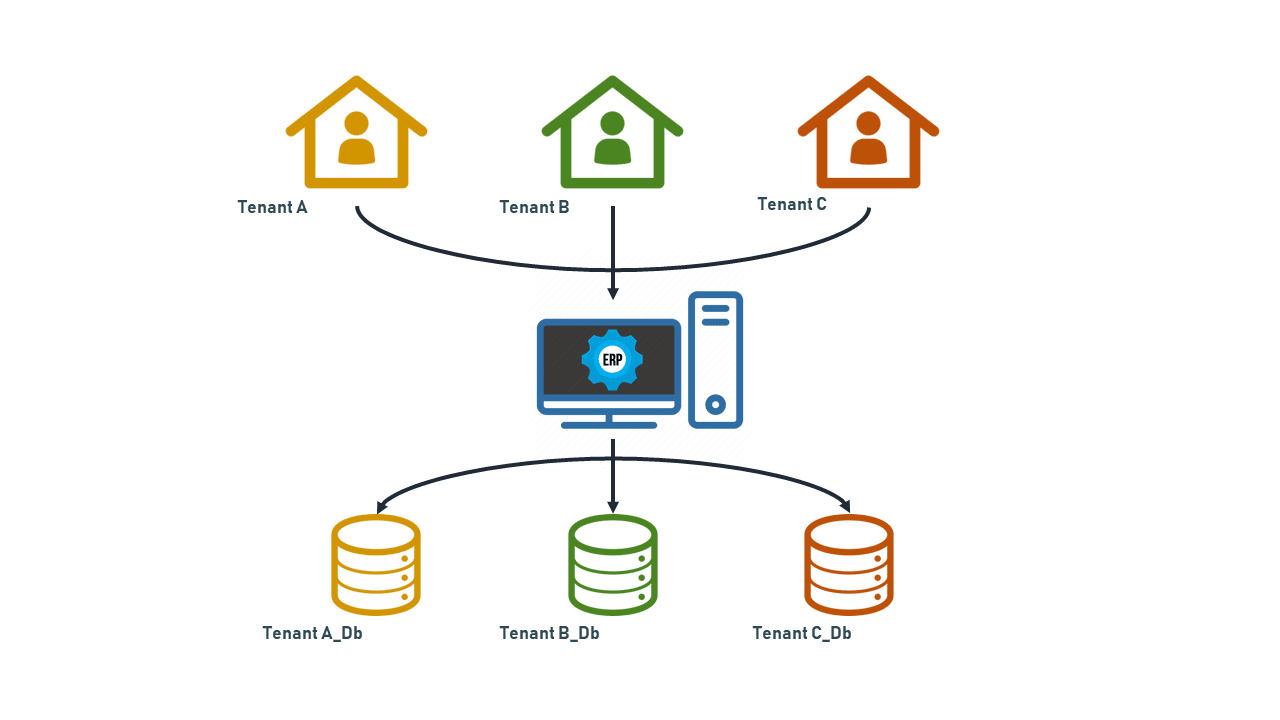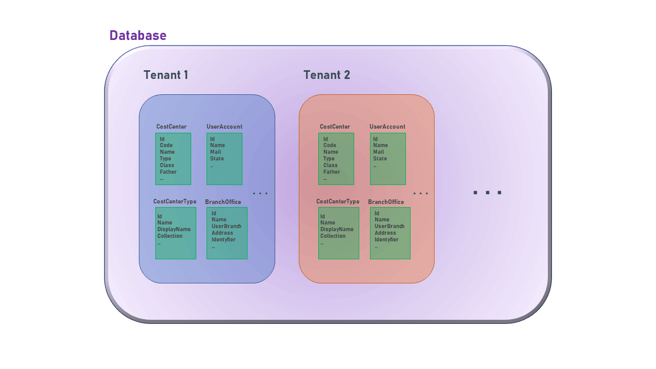 Hay que agregar que, esta solución está diseñada bajo el principio de tenencia múltiple, con el objetivo de brindar servicios a diferentes empresas o consumidores. Se utilizan dos tipos diferentes de tenencia múltiple, la primera es la de diferentes inquilinos o tenants en la misma base de datos, es decir que todas las entidades configuradas se encuentras encapsuladas bajo un filtro global, que identifica a que tenant pertenece ese conjunto de información. Este atributo se puede encontrar bajo el nombre de TenantId. Esta estructura de datos se puede observar con mejor claridad en el siguiente diagrama: