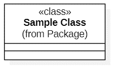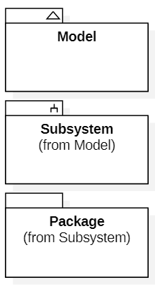Ordenados jerárquicamente tenemos 3 tipos de paquetes: Model, Subsystem y Package. Model: Captura una vista abstracta del sistema, hace referencia a las carpetas de la solución. Subsystem: Una sección del modelo, útil para descomponer grandes sistemas, hace referencia a los proyectos dentro de la solución. Package: Provee un Namespace dentro del proyecto y agrupa los distintos elementos de código. |