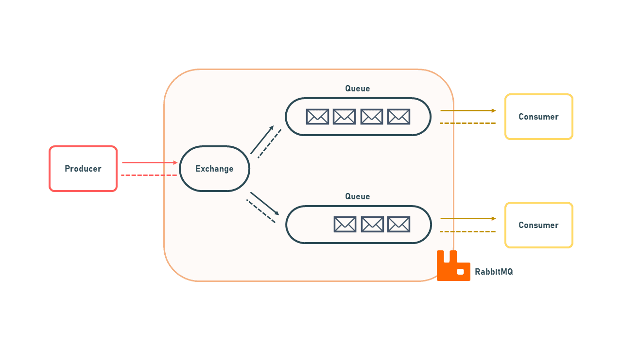 El productor es la aplicación que crea el mensaje y lo envía, el exchange acepta el mensaje y enruta la información a la cola correspondiente, esto es posible ya que ambos se encuentran identificados con una clave de ruta y una clave de enlace respectivamente. Existen 3 formas en que el exchange enruta los mensajes que recibe a los respectivos queues :