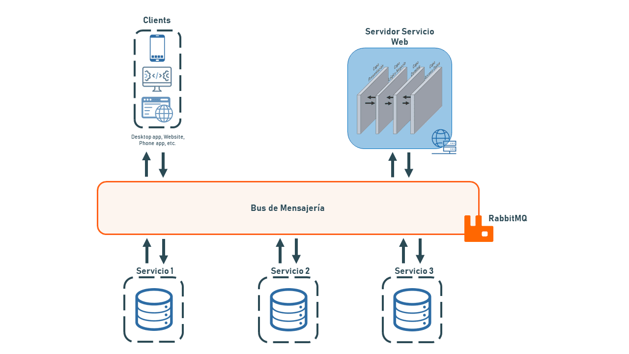 El servicio de message broker que se utiliza en la solución es RabbitMQ. Es un software gratis y open-source. En su arquitectura implementa el protocolo AMQP (Advanced Message Queuing Protocol). En el siguiente diagrama se observa el lugar que ocupa RabbitMQ como servicio de mensajeria entre las aplicaciones y servicios de la solucion.