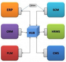 Las aplicaciones se comunican con el hub a través de extensiones del mismo que se conocen como spoke. Son APIs y protocolos específicos para cada aplicación, y que forman parte del hub en lugar de la app en sí.