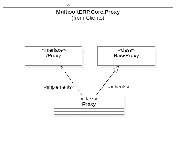 Finalmente, la clase Proxy implementa la interfaz y hereda de la clase base, y en donde se declaran todas las rutas de las entidades de negocio que la API ofrece, y donde se implementan los métodos de la interfaz, y su implementación son direccionados o traducidos a un tipo de HTTP request que se heredan de la clase base, para finalmente hacer log de errores y advertencias del resultado de estas solicitudes.
