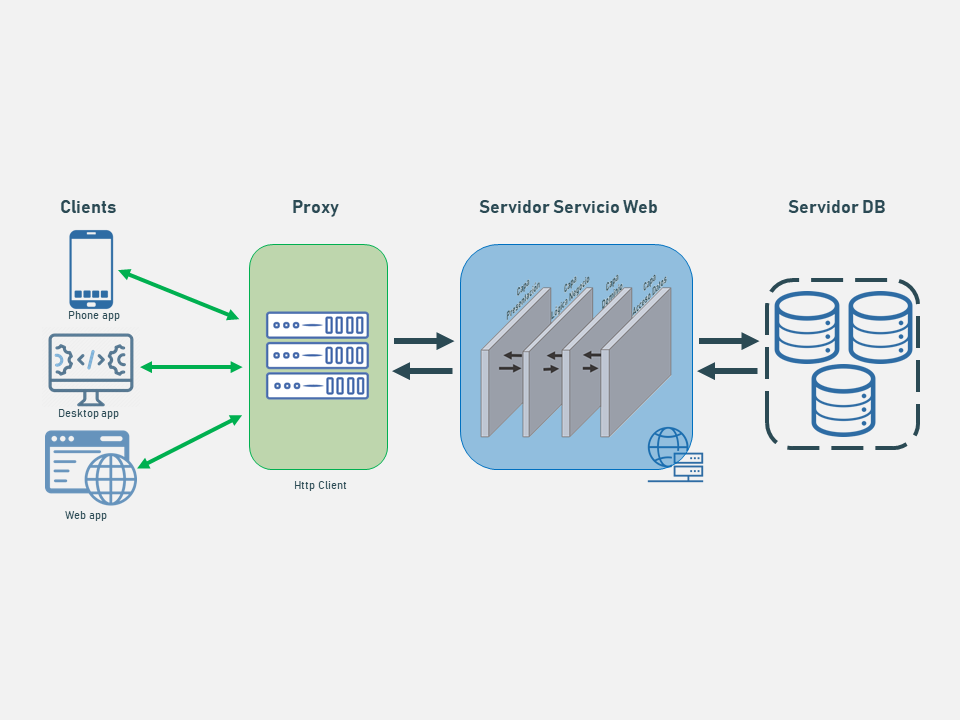 A continuación, se muestra el esquema de comunicación que existe entre las aplicaciones clientes con el Proxy, el cual actúa como intermediario con el servidor web, donde están alojadas todas las capas de servicios que ya fueron mencionadas, este servidor extrae la información de la base de datos y presenta los resultados de vuelta al proxy y finalmente a las aplicaciones que hicieron la solicitud.