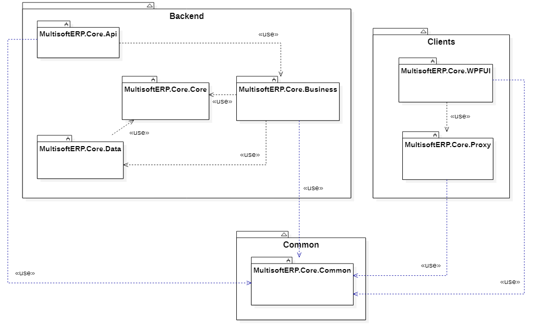 Por otro lado las cuatro capas de servicio en Backend siguen la arquitectura de múltiples capas, en donde las capas superiores hacen uso, o tienen referencias de las capas inferiores, pero no asi las inferiores de las superiores. Al menos que sea la inmediata superior como son el caso de Core.Data con Core.Core.