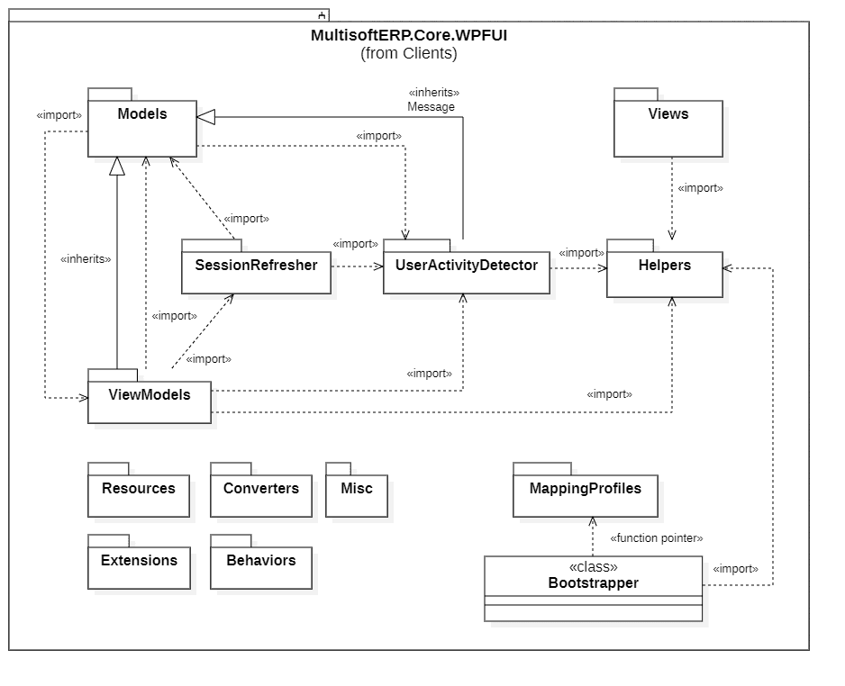 Dentro del grupo de paquetes secundarios que se muestran en el diagrama se observa a Resources, el cual contiene assets como el background de la aplicación, el ícono de la aplicación, gif de animaciones, paquete de lenguajes, archivos .xaml con las rutas de los iconos del menú lateral y barra de tareas, entre otros.