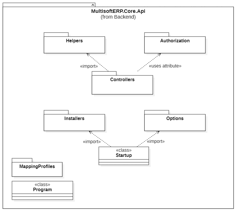En el diagrama de la Web Api, se tiene al paquete Controllers, que contiene los controladores de las entidades de negocio, con los cuales se manejan los HTTP requests, ya sea para obtener, modificar o agregar información del servidor web. Estos controladores y sus funciones son accedidos usando un sistema de autorización basado en claims. Los atributos de estas claims se encuentran definidos en el paquete Authorization. En el caso de haberse manejado una solicitud de obtener información para ser presentada, se utiliza el paquete de Helpers con el cual se crea una respuesta paginada dependiendo del query de paginación que se haya definido.